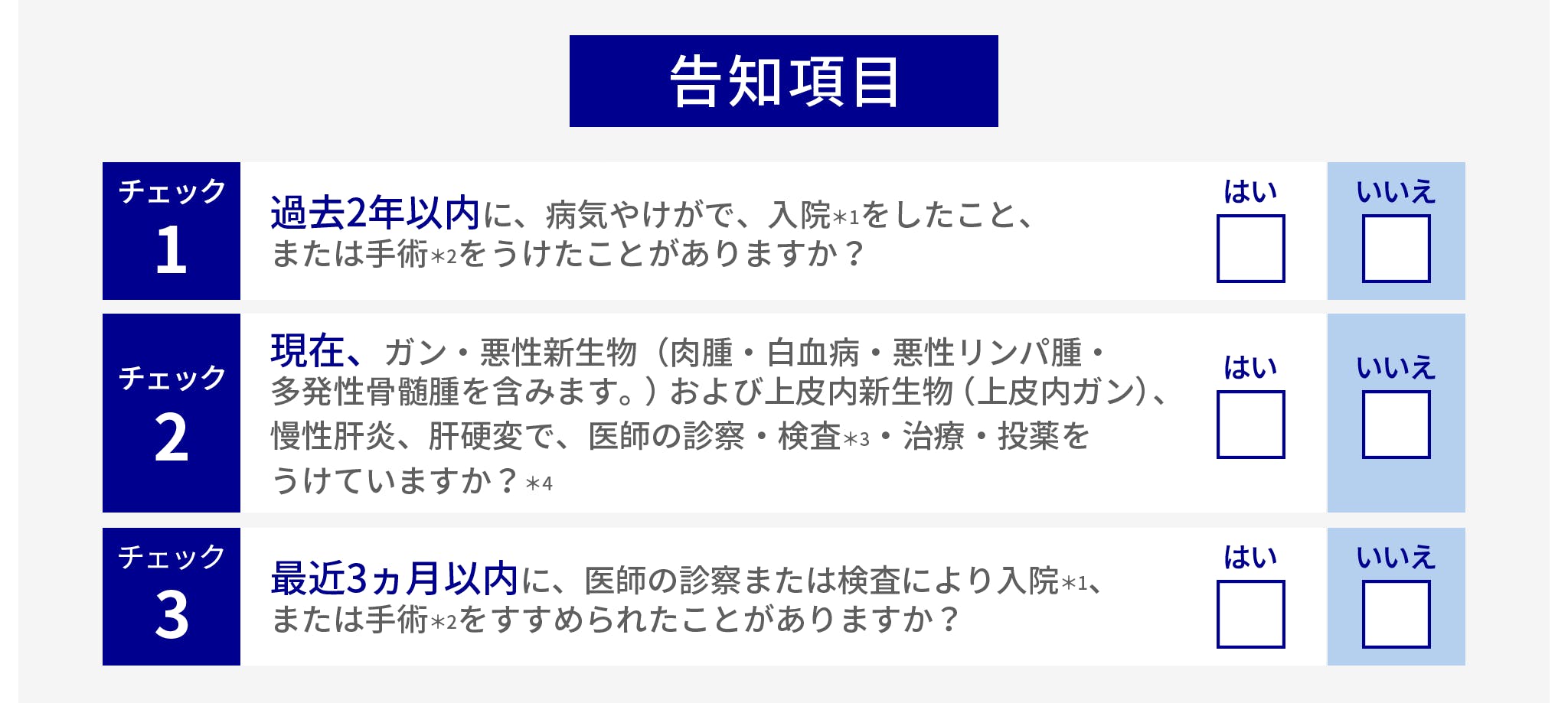 「限定告知型3大疾病保険料払込免除特約」を付加される場合は別途、告知が必要です。詳しくは特約2をご覧ください。