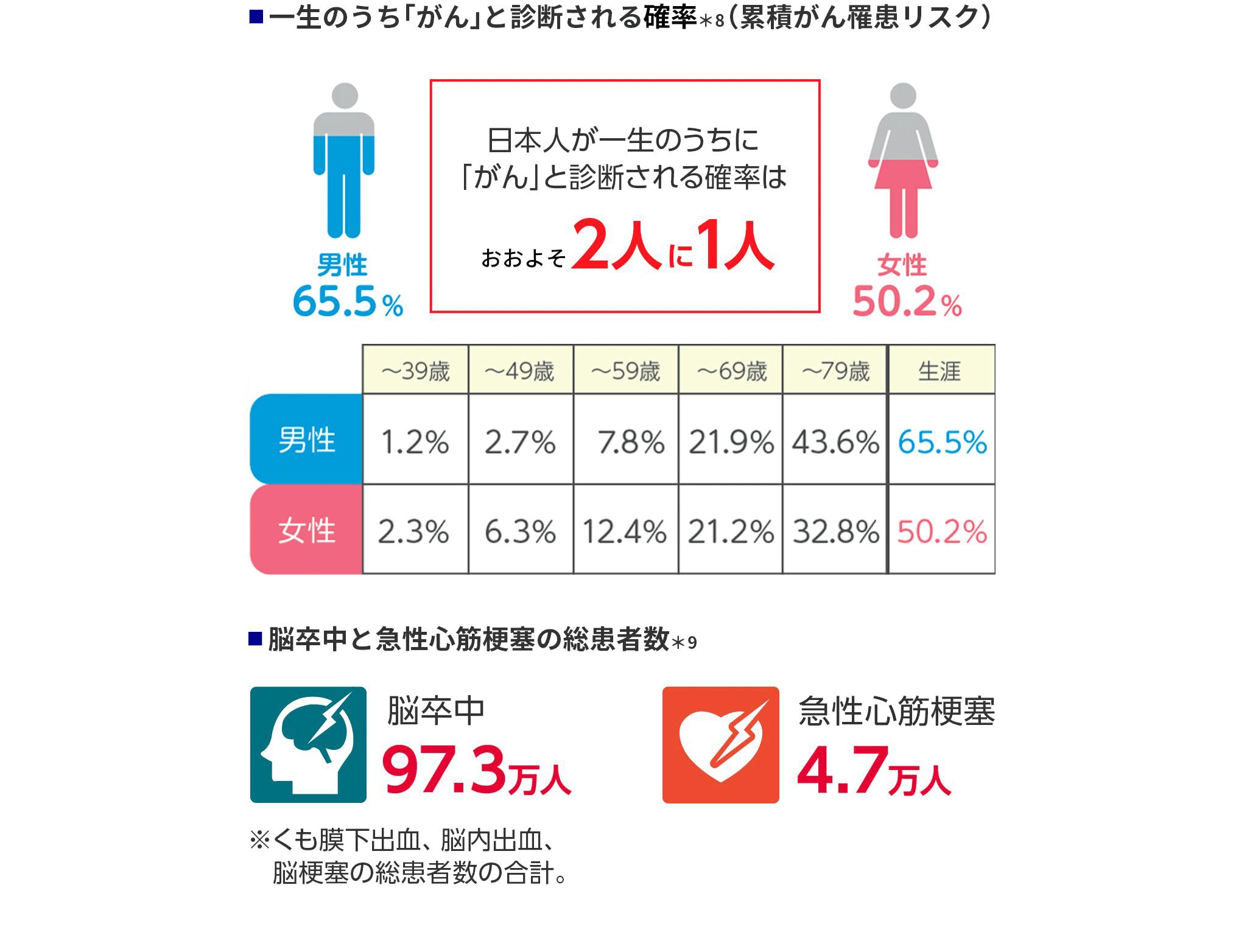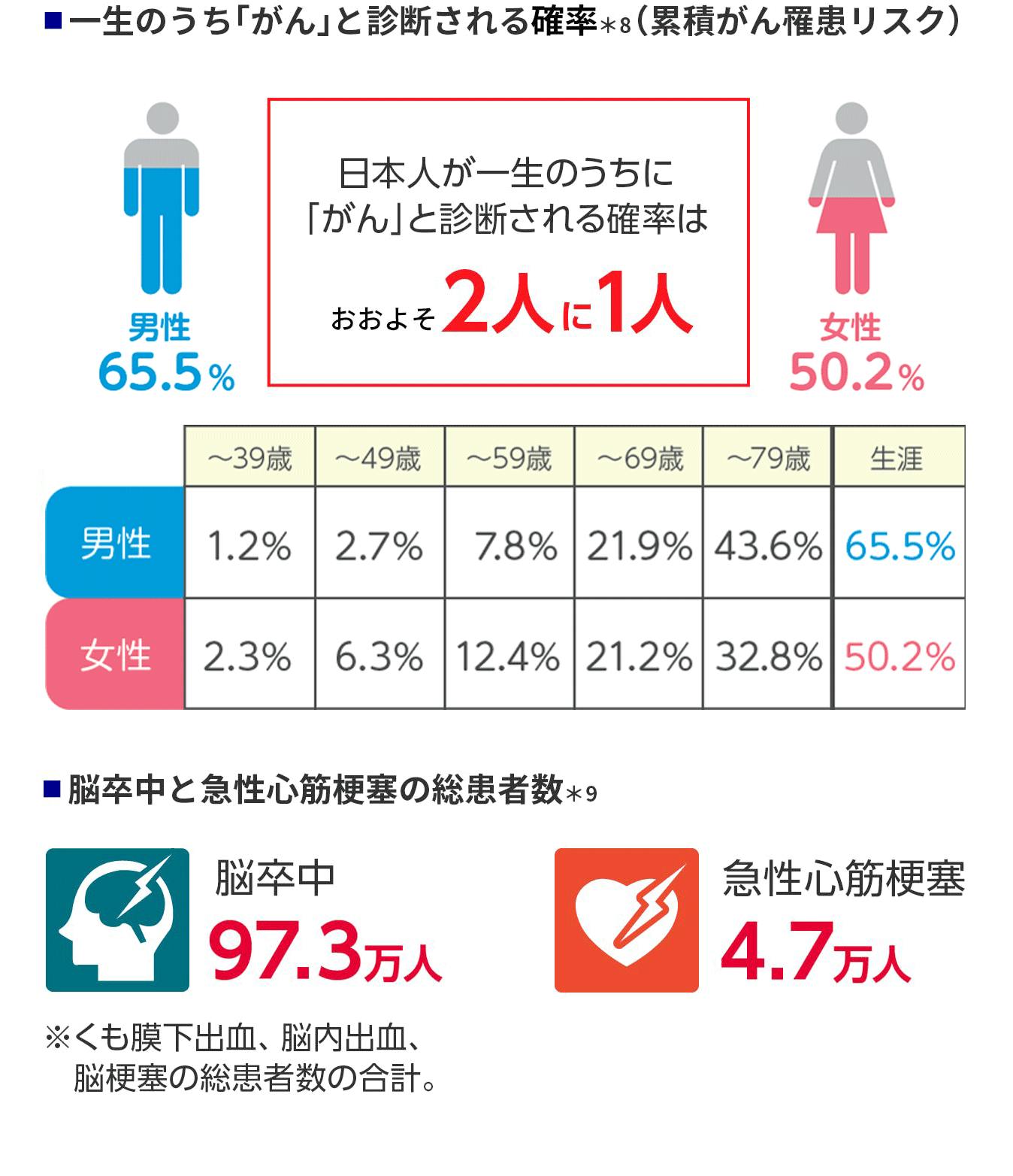 今や3大疾病(がん、脳卒中、急性心筋梗塞)は身近な病気です。