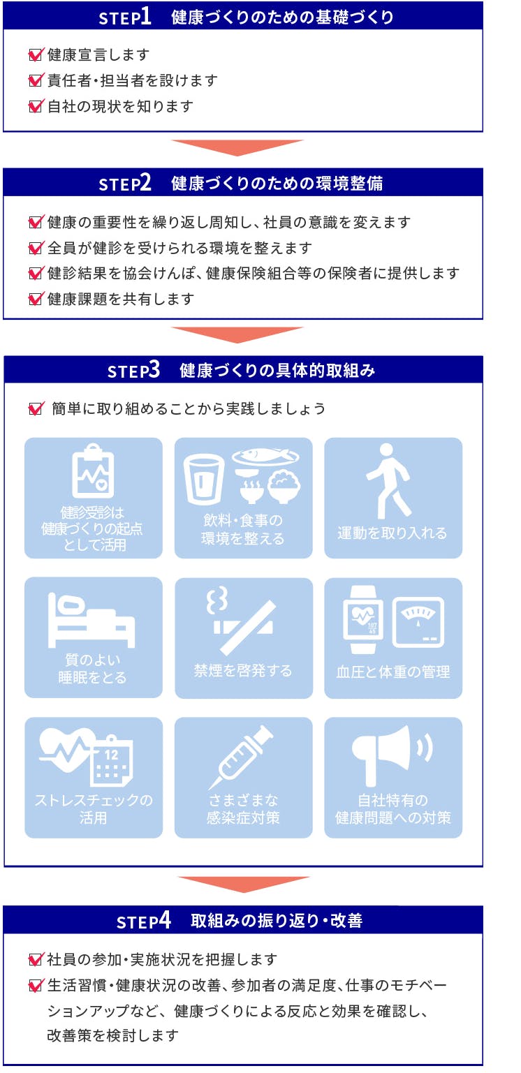 健康経営の基本的な流れは、下記の4STEPに分けられます。