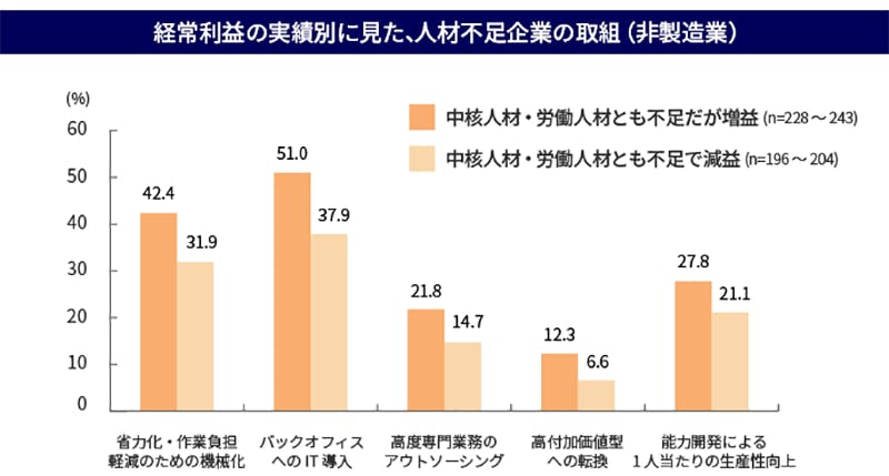 また、人材不足でも業 績を伸ばす企業は省力化、アウトソーシングに加えて、IT導入にも積極的に取り組んでいるとのデータもあります。少ない人的リソースでも業績を伸ばす ― まさに目指すべき生産性向上が叶っている、と見て取れます。