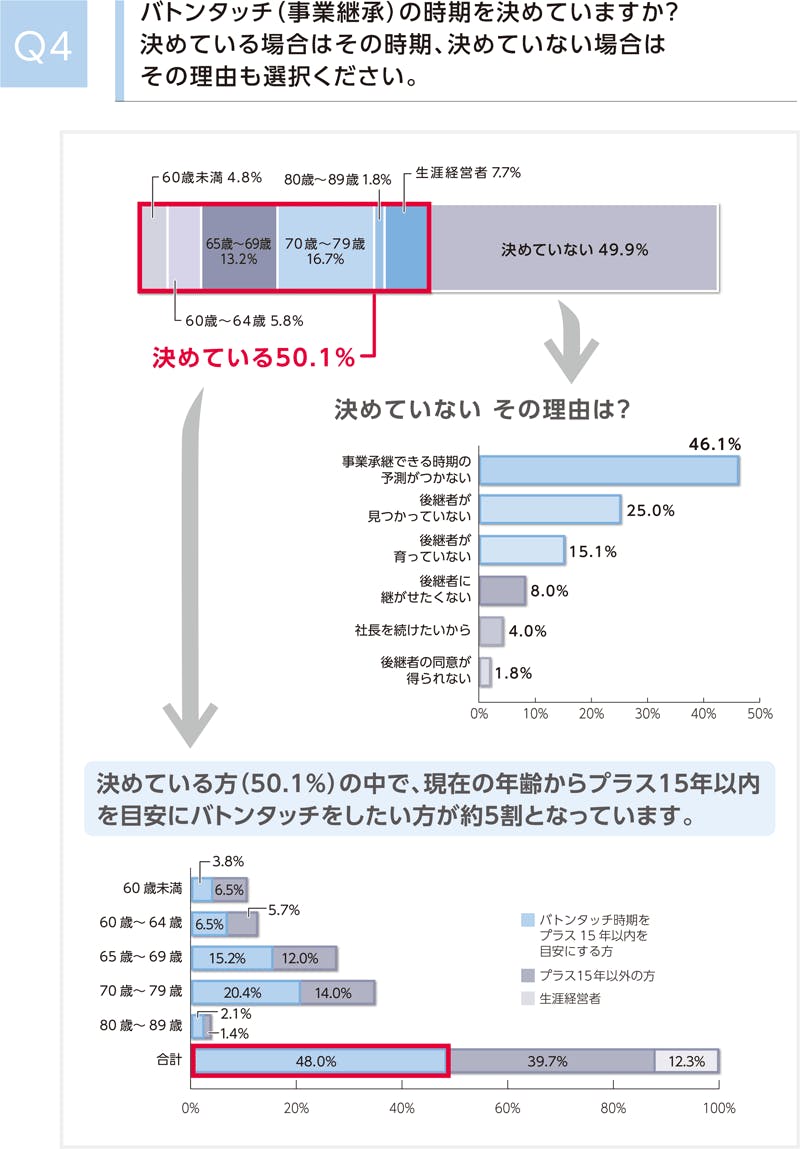 同「社長さん白書」では、「バトンタッチ(事業承継)の時期を決めていますか?決めている場合はその時期、決めていない場合はその理由も選択ください」と質問してみました。すると、次のような結果が…。