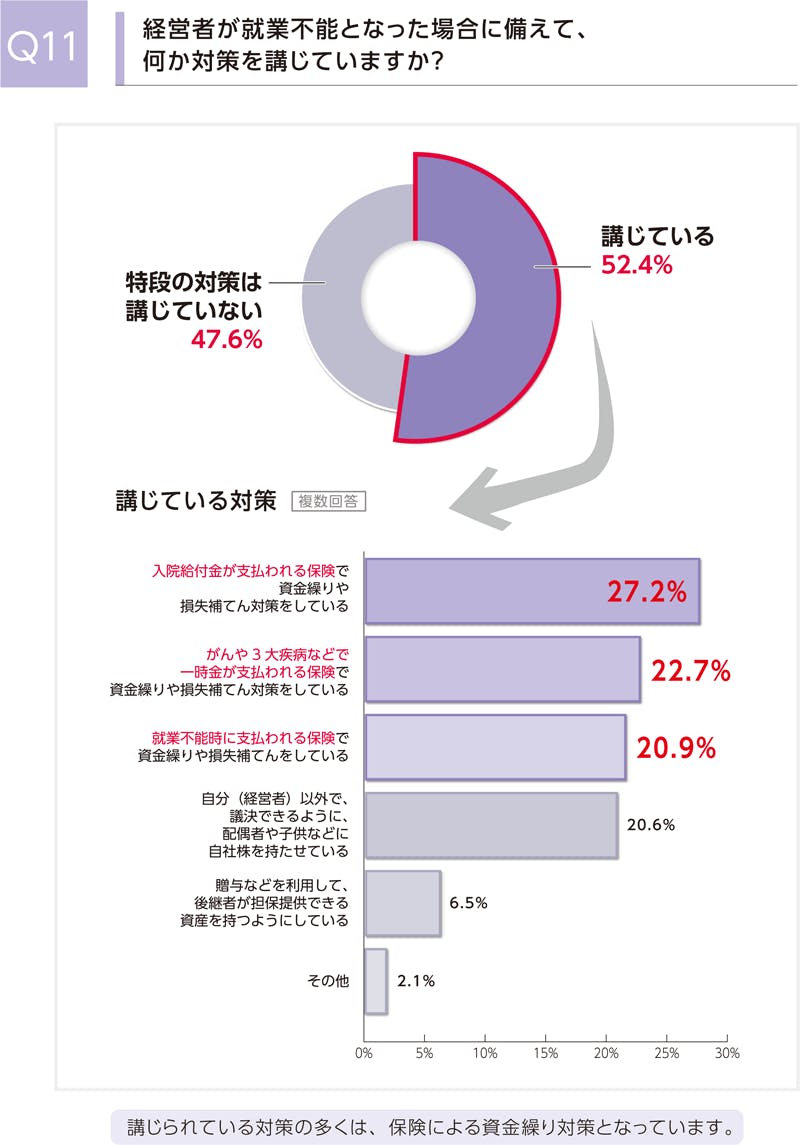 その内容は、「入院給付金が支払われる保険で資金繰りや損失補填対策をしている(27.2%)」や「がんや3大疾病などで一時金が支払われる保険で資金繰りや損失補填対策をしている(22.7%)」「就業不能時に支払われる保険で資金繰りや損失補填対策をしている(20.9%)」といったもので、講じられている対策の多くは保険による資金繰りや損失補填の対策に集中しています。