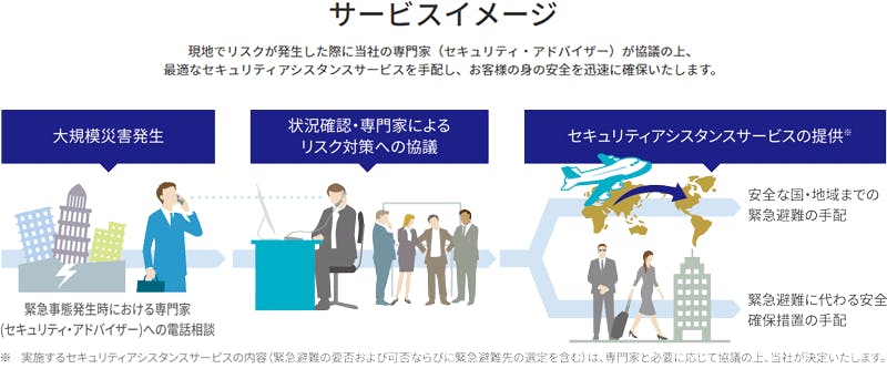 「海外危機対策プラン」にご加入いた だいている会員企業さまは、自力で帰国手配ができない場合に、セキュリティアドバイザーの判断により、アクサ・アシスタンスの費用負担にて帰国サポートもしくは安全確保措置を提供します(実費自己負担なし)。