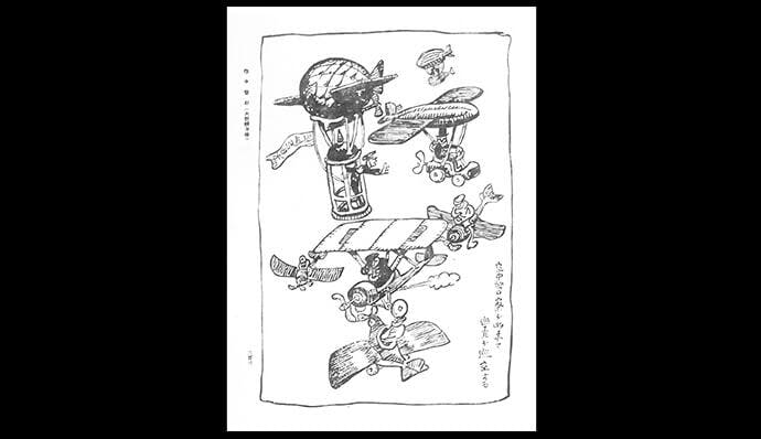 「日本及日本人」の特集で使用された挿絵。100年後は空を飛ぶ「空中警察」が登場すると描かれています。