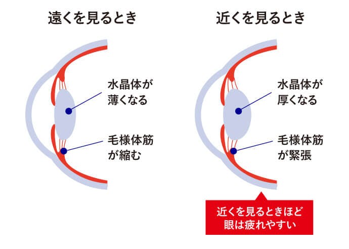 「スマホ老眼」は、近くを見る時に水晶体レンズを厚くしてピントを調節している毛様体筋が疲れ果て、うまく働かなくなってしまった状態です。これは老眼と同様の症状で、長時間、近くばかり見ていると起こりやすくなります。