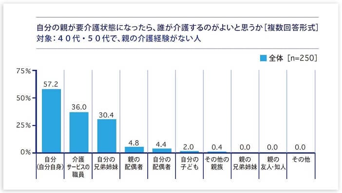 40代・50代で、親の介護経験がない人に、自身の親も介護が必要な状態になったら、誰が介護するのがよいと思うか尋ねたところ、「自分(自分自身)」(57.2%)が最も高く、次いで、「介護サービスの職員」(36.0%)、「自分の兄弟姉妹」(30.4%)となりました。親の介護は自分の役割だと考えている人が半数を超える結果になっています。