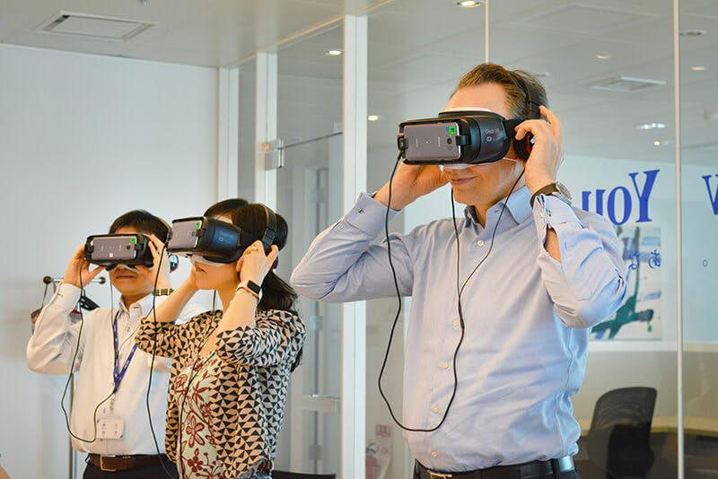 VR認知症体験会に参加する安渕聖司(アクサ生命 代表取締役社長兼CEO)
