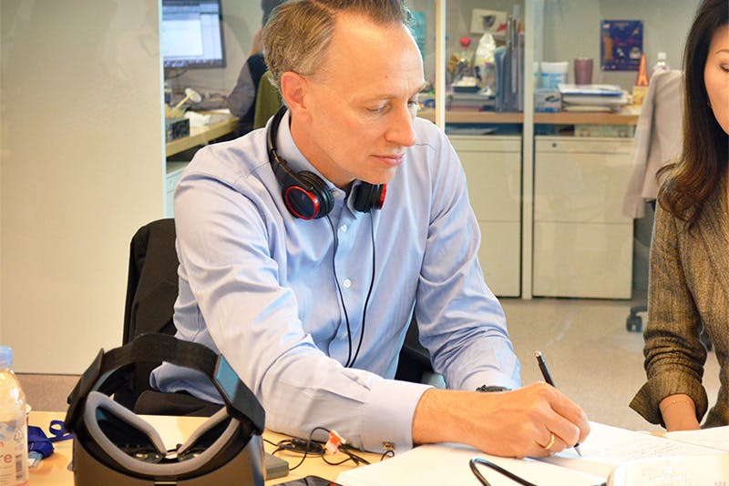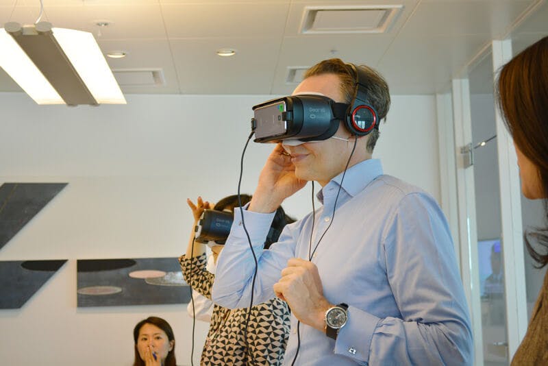 VRゴーグルを装着するトーマス・ブベル(AXAグループCEO)