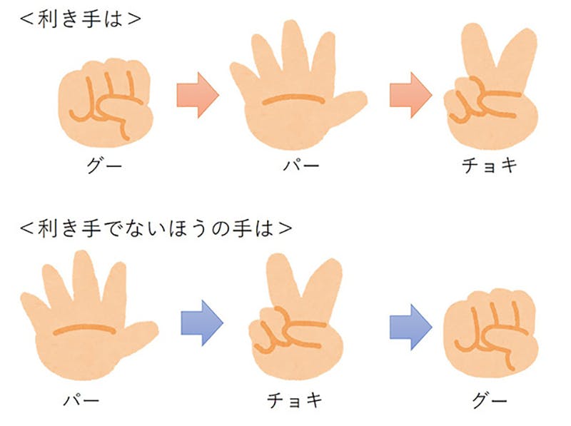 例えば、「利き手で空中に三角形を書きながら、同じスピードで利き手でないほうの手では四角形を書く」「同じタイミングで、利き手はグー、パー、チョキ、左手はパー、チョキ、グーの順番で 出す」といった内容になります。