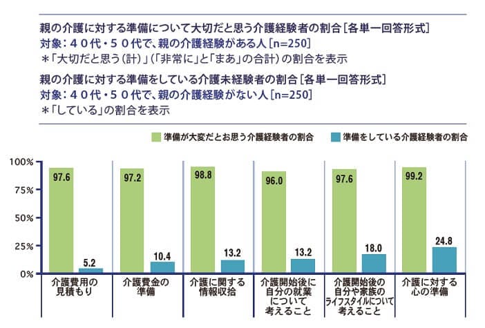 一方、親の介護をすでに経験した40代・50代のひとは、親の介護にどう準備しておけばよかったと考えているのでしょうか?