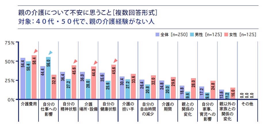 ここで特筆すべきは、介護経験の 有無によって、「介護費用の見積もり」や「介護資金の準備」への捉え方が大きく違う点です。ただし、介護経験がない40代・50代がそうしたことを心配していないかというと、そういうわけではないようです。「親の介護で不安に思うことはなにか?」と尋ねたところ、介護経験がない子世代も、54.4%が「介護費用」を挙げています。これは、「自分のしごとへの影響」(44.4%)、「自分の精神状態」(36.4%)、「介護場所・設備」(36.6%)、「自分の健康状態」(35.6%)よりも高い数字です。