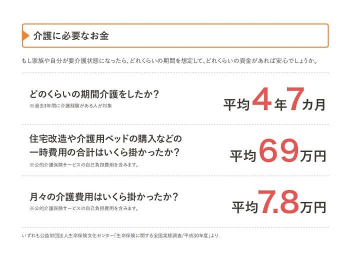 公益財団法人生命保険文化センターが発表した「生命保険に関する全国実態調査/平成30年度」によると、過去3年間に介護経験があるひとが経験した介護期間は、平均4年7ヶ月。この間、公的介護保険サービスの自己負担費用を含む月々の介護費用は平均7.8万円※くらいかかったとの結果が出ていま す。これに加え、介護用ベッドの購入や住宅改造など、一時的に必要な費用は平均69万円※になった、ともあります。
