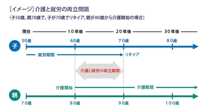 前出の調査では、親の介護経験がない40代・50代の人に対し、「親の介護が始まると思う年齢」と、「自身が働き続けたい年齢」の関係を「介護と就労の両立」として見たところ、親の介護期間と自分の就労期間が重なる人が多いことがわかりました。