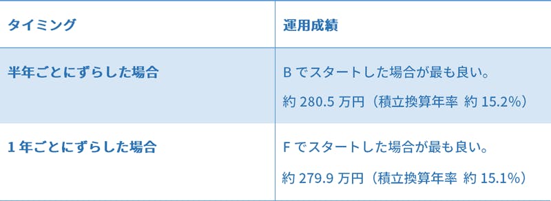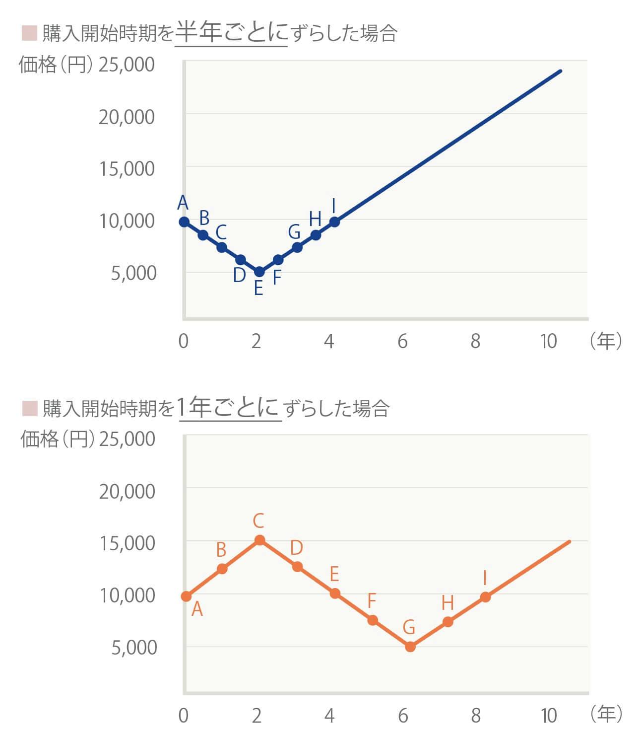毎月の積立投資を開始するタイミングを、半年ごとにずらした場合(左)と、1年ごとにずらした場合(右)で考えてみましょう。A~Iはそれぞれ毎月積立を開始したタイミングです。