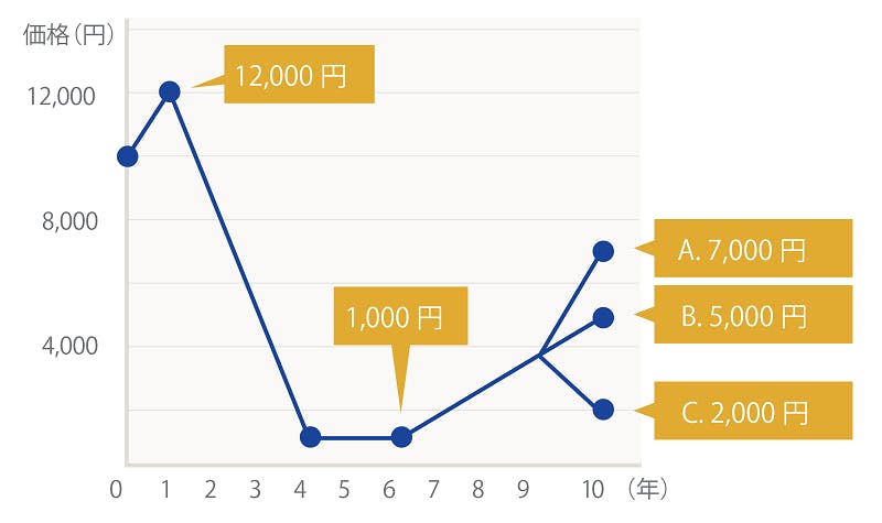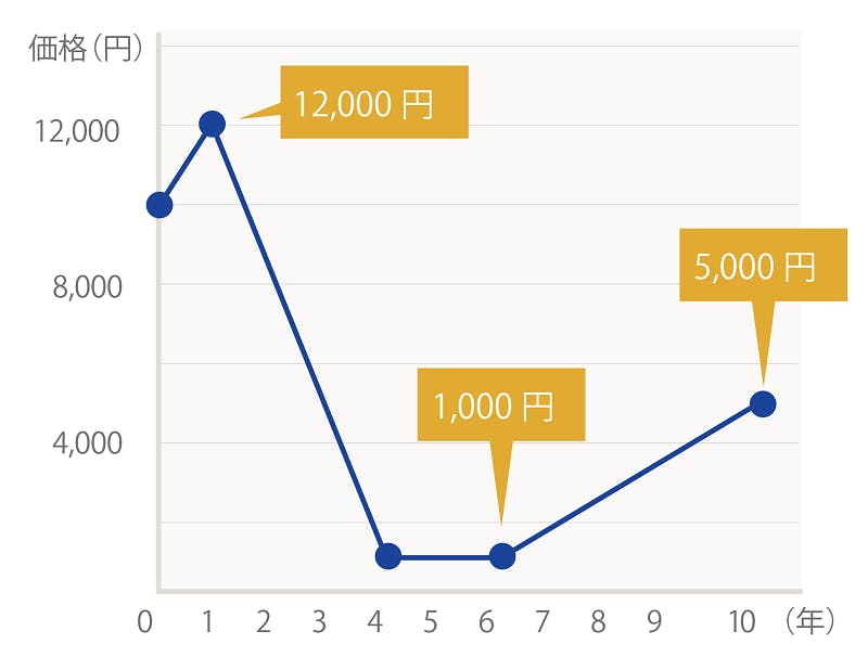 スタート時の価格が10,000円の金融商品を選んで投資を開始したところ、 投資開始後1年目までは12,000円まで上昇した後、4年目に1,000円 まで下落。6年後から回復し10年目に5,000円まで戻ったとします。