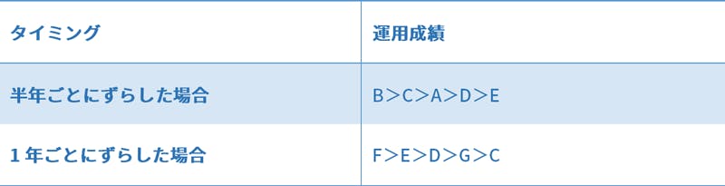 投資効果の高いトップ5の開始タイミングを上から順番に並べると、以下のようになります。