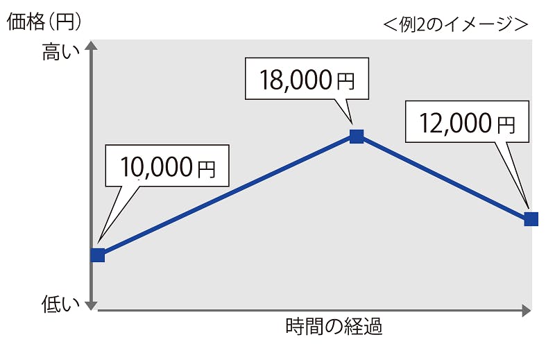 上記の図のように、一時は18,000円だった価格が12,000円まで下がってしまうというようなことも十分にあり得ます。高値の時期が長く、急激に価格が下落すると、マイナスになる可能性が出てきます。投資した金融商品を売却したいタイミングによっては、このようなことも起こり得ることを念頭に置いておきましょう。