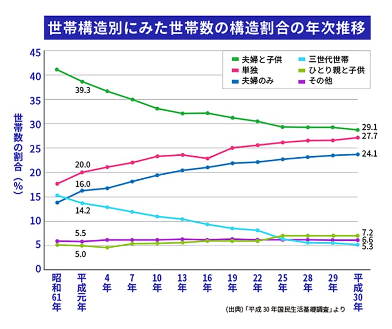 厚生労働省の「平成30年国民生活基礎調査」によると、平成から令和にかけて大きく減少しているのが、いわゆる標準モデルともいえる「夫婦と未婚の子のみの世帯」(平成元年39.3%→平成30年29.1%)。逆に上昇しているのが、「単独世帯」(20.0%→27.7%)と、「夫婦のみの世帯」(16.0%→24.1%)です。