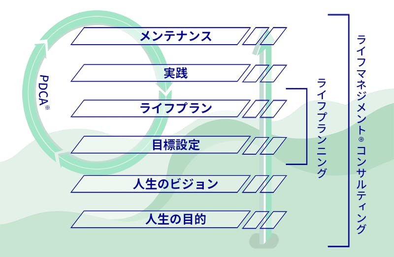 人生の理念とそれに基づいた目的やビジョンを土台にして、何を、いつ達成するのかという「目標」と、実現するための計画「ライフプラン」 を作成し、実践していくプロセスが「ライフマネジメント®」です。