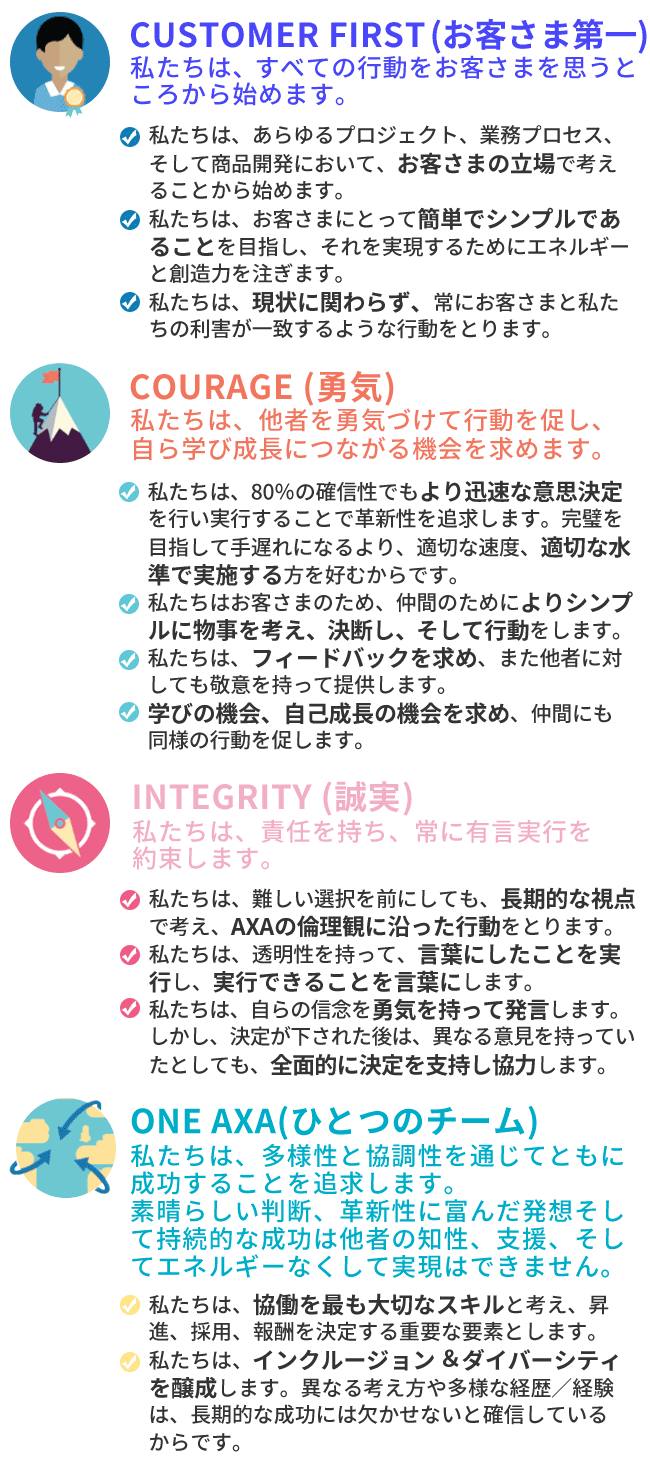 この5つの基本方針は、アクサグループ共通の「Our Commitments - 私たちの誓い」に沿ったものです。この「Our Commitments - 私たちの誓い」の中で、「CUSTOMER FIRST (お客さま第一)」を経営の根幹に置き、お客さまや社会のより良い未来のために日々の業務を遂行してま いります。