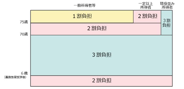 医療費の自己負担割合は、6歳(小学校入学前)までは2割、6歳~70歳未満は3割です。70歳以上は、年齢や所得に応じて下記の3種類にわかれています。