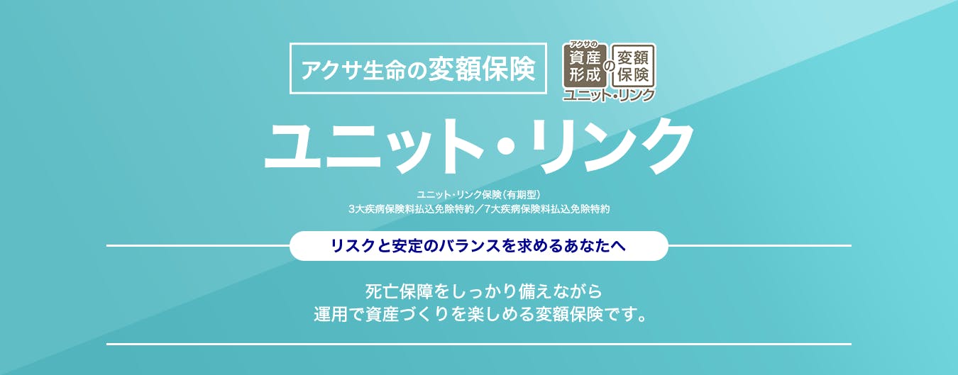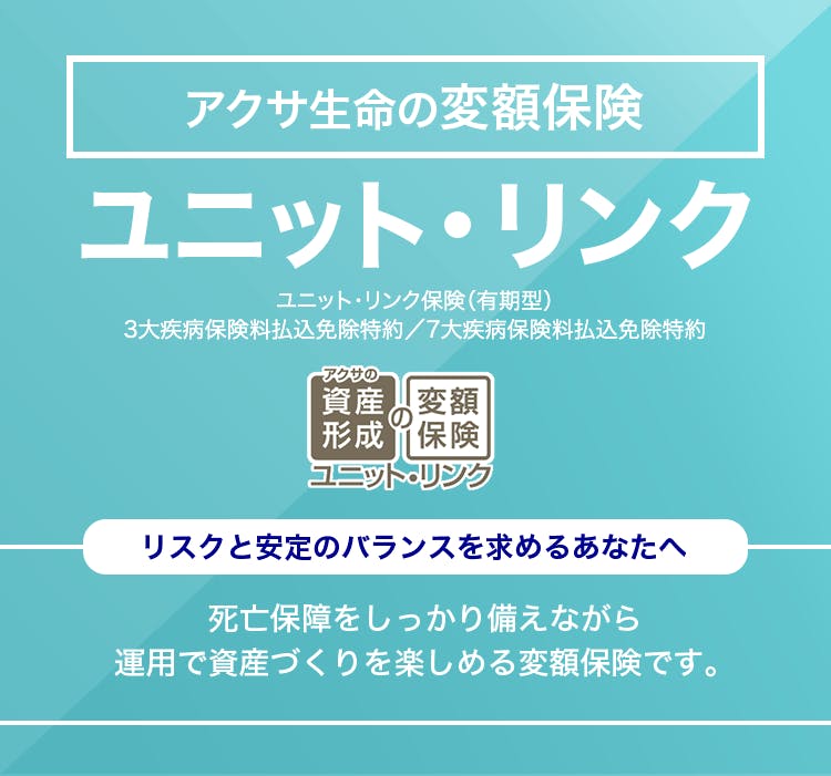 この商品のご契 約は、お払込みいただいた保険料の一部を特別勘定で運用するもので、金融商品取引法の販売・勧誘ルールの準用対象となる特定保険契約に該当します。お申込みに際しては、「契約締結前交付書面(契約概要/注意喚起情報)」をご契約前に十分にお読みいただき、投資リスクや負担いただく諸費用などの内容についてご理解・ご了解ください。