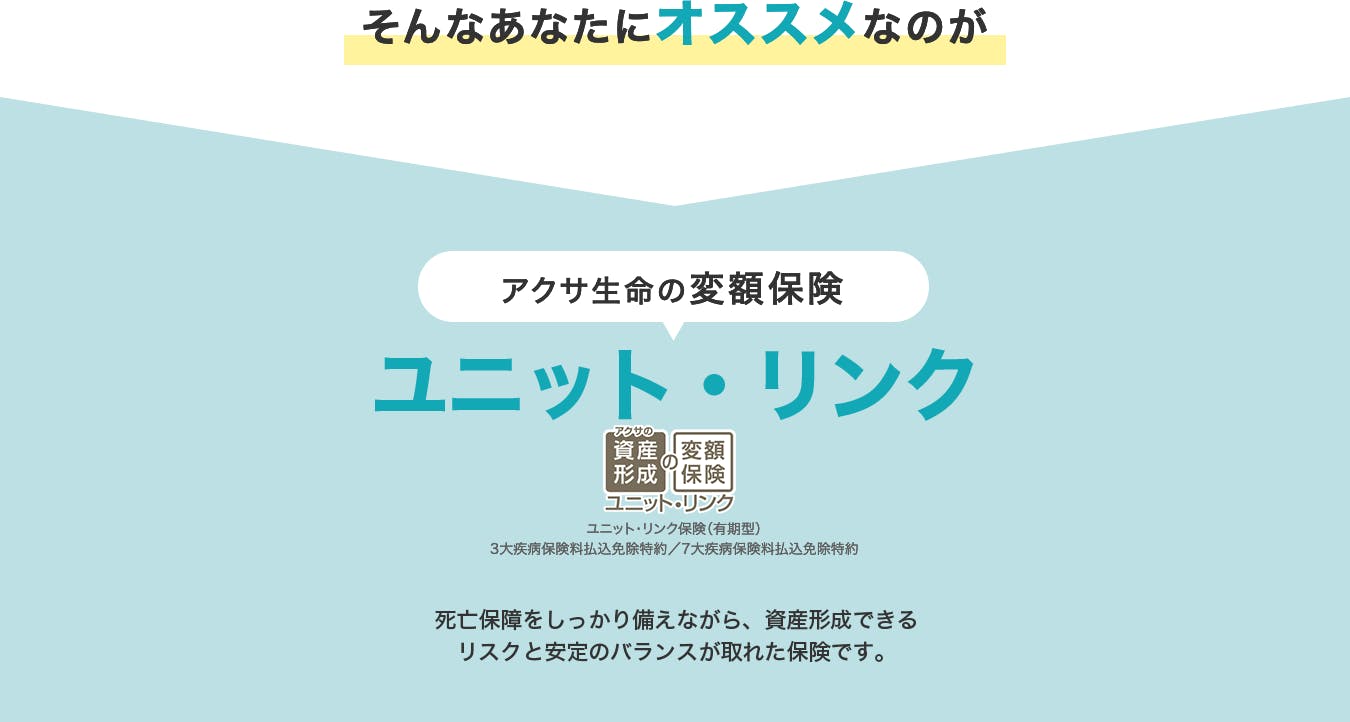 ユニット・リンクは、ひとりひとりのお客さまのライフプランや将来の夢に合わせた内容を選択できる保険です。まずは、専門スタッフとあなたの未来について考えてみませんか?