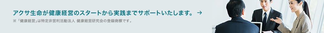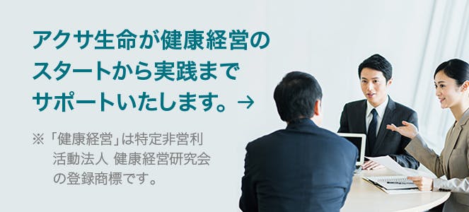 従業員の健康に配慮し、健康を維持、増進に取り組むことは、企業の生産性を向上させる、リクルート効果が高まるなど経営にとってプラスの効果が期待できます。健康経営の実践を、「アクサ生命の健康経営アドバイザー」がサポートします。
