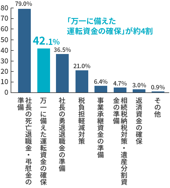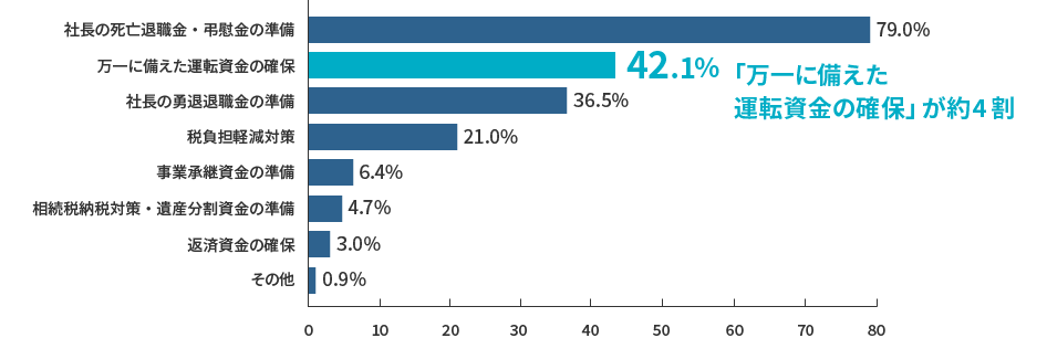 社長の生命保険加入目的は、「万一に備えた運転資金の確保」が「社長の死亡退職金・弔慰金の準備」に次いで多くなっています。
