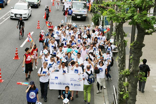 2年前23組だったパレード参加団体が2019年は40組を超え、参加人数も1万人を超えました。アクサの参加者の中には2017年から参加している社員も多く、その社員が家族やパートナー、友人を誘って、徐々に人数が増えています。代表取締役社長兼CEOの安渕聖司をはじめ、役職も部門もさまざま、年齢もさまざま、グループ会社の仲間たちも一緒に歩く。その目的は、LGBTQ+の当事者を含め、誰もが自分らしく生き、働き、人生を楽しめる社会を目指すことです。