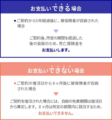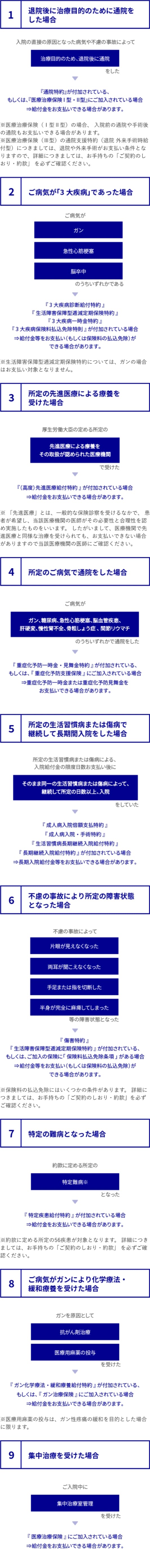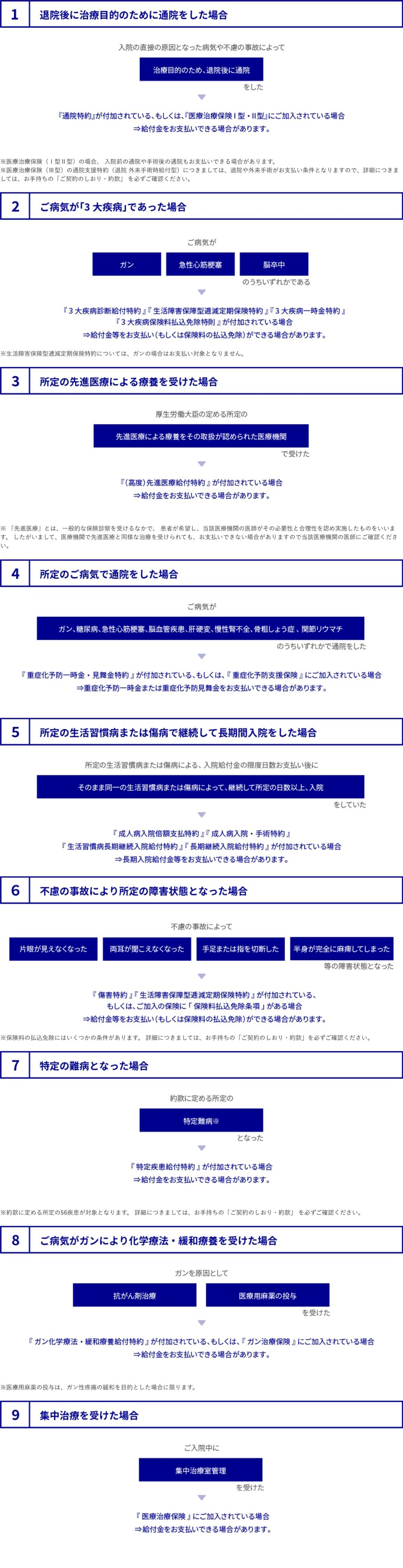 お支払いの対象となるには、いくつかの条件があります。条件によっては、お支払いできない場合もありますので、詳細につきましては、お手持ちの「保険証券」と「ご契約のしおり・約款」を必ずご確認ください。