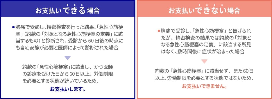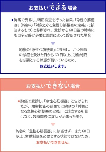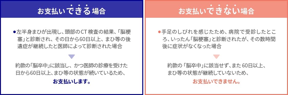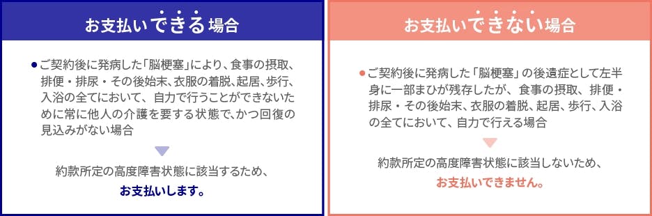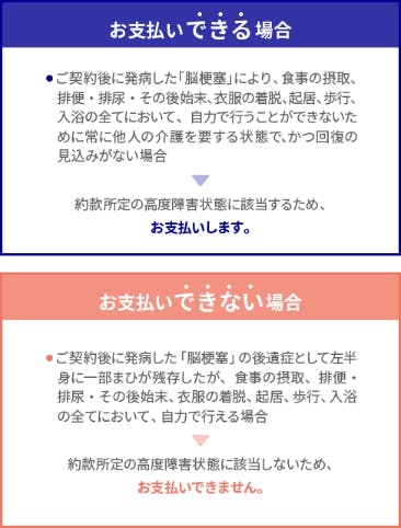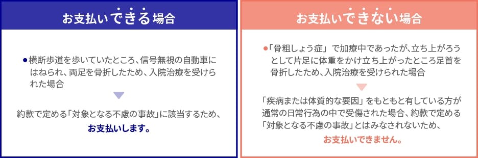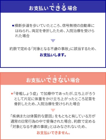 下記は、保険金・給付金をお支払いできる場合、またはお支払いできない場合をわかりやすく説明するために、代表的な事例をあげたものです。ご契約の保険種類や契約時期によってはお取扱いが異なる場合がありますので、ご加入されている保険契約の保障内容については、「保険証券」「ご契約のしおり・約款」を必ずご確認ください。