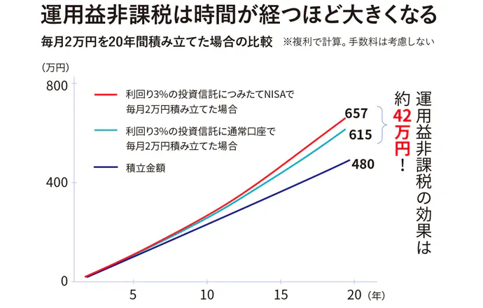 ​上のグラフのシミュレーションのように、月額2万円を利回り3%で運用、という同じ条件でも、通常の証券口座と、非課税口座(つみたてNISA)では、20年で約42万円の差がつきます。
