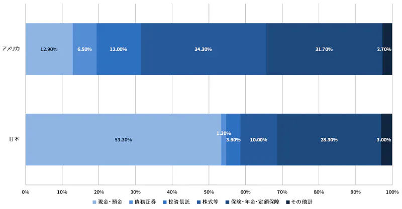 アメリカなどでは「自分の資産は自分でつくる」という意識が強く、様々な金融商品を組み合わせながら、資産形成をすることがスタンダードとなっています。以下の日本銀行調査当局から発表されているデータをみてみると、アメリカは日本と比べて資産を現金・預金で保有している割合がかなり低く、その代わりに投資信託や株式、保険などの金融商品で資産を保有していることがわかります。