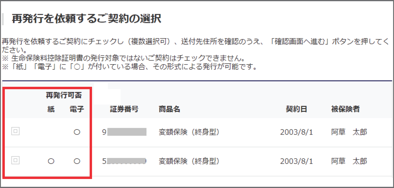 「控除証明書の発行(再発行)」ページで、発行を依頼する契約を選択ください。