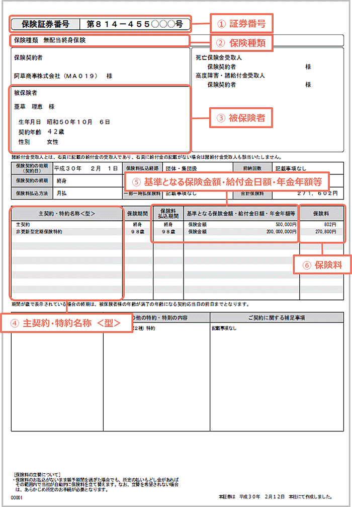 保険証券サンプル(右ページ)