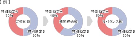 リバランスとは、それを一定の期間ごとにご指定の割合に戻るように自動調整する機能です。期間は「3ヵ月」「6ヵ月」「1年」から選択できます。例えば「3ヵ月」を指定すると、3ヵ月ごとに積立割合を自動調整します。新規設定、変更および中止が可能です。