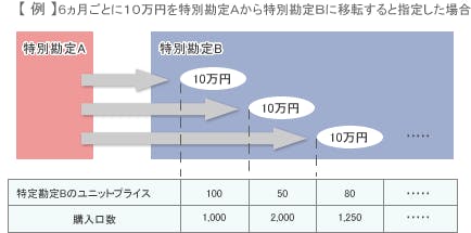 期間は「1ヵ月」「3ヵ月」「6ヵ月」「1年」から選択できます。移転金額は1円単位で指定できます。例えば、期間を6ヵ月、移転金額を10万円、移転元を特別勘定A、移転先を特別勘定Bと指定すると、6ヵ月ごとに10万円が特別勘定Aから特別勘定Bに規則的に移転されます。