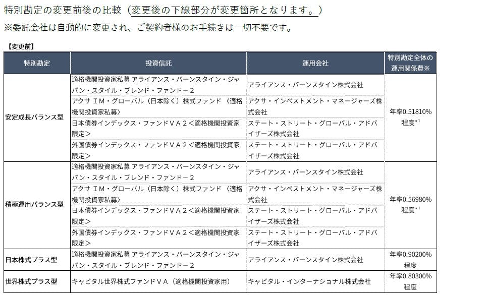 各特別勘定に使用されている投資信託、運用会社の一部を変更します。