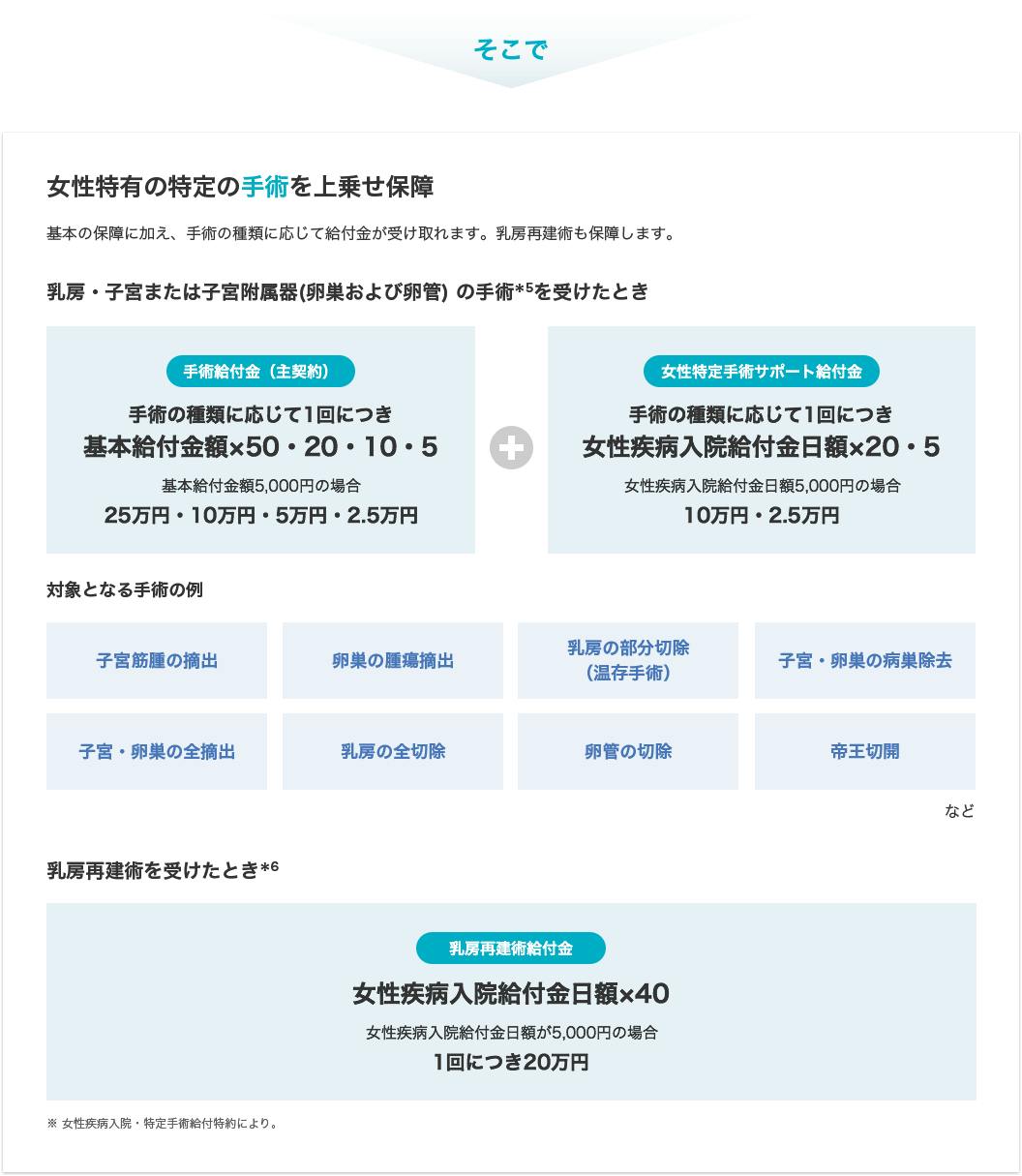 お支払対象となる手術は、主契約の手術給付金のお支払事由に該当する手術に限ります。ただし、特定不妊治療、乳房再建術および子宮頸管ポリープ切除術はお支払いの対象になりません。