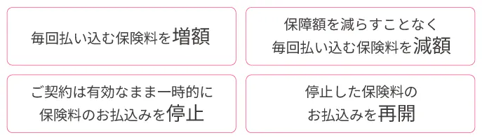 ​また、月々の保険料が負担になった時も、保障額を減らさずに保険料を変更することができるので安心です。