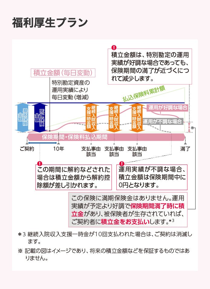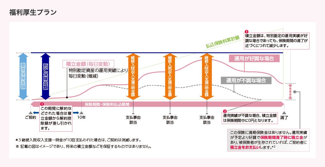 ユニット・リンク長期入院一時金プラスでは、特別勘定で資産が運用されるため、成果によって払いもどし金額や積立金が増減します。